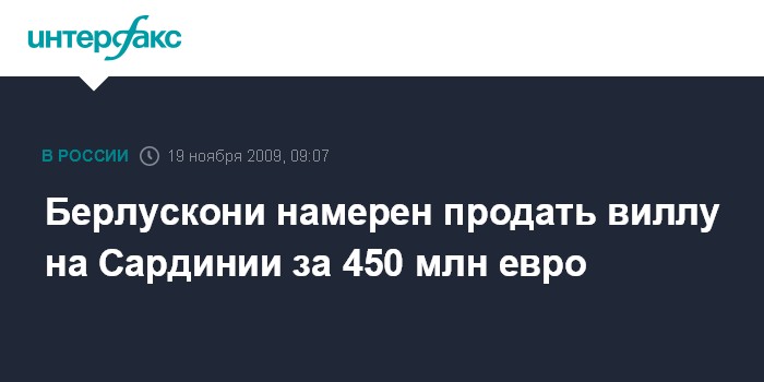 Москва. 19 ноября. INTERFAX.RU - Председатель Совета министров Италии Сильвио Берлускони планирует продать свою виллу на острове Сардинии за 450 млн евро, пишет в среду газета "Коррьере делла сера".