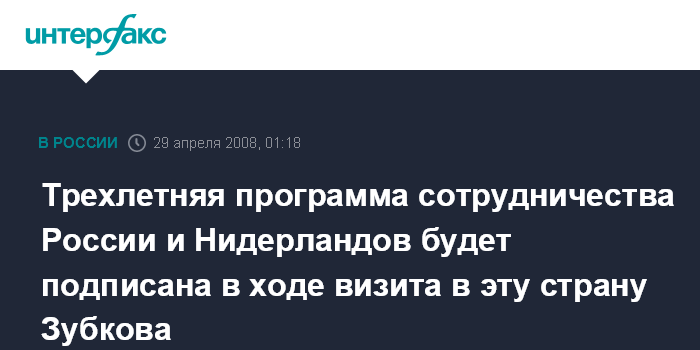 Трехлетняя программа сотрудничества России и Нидерландов будет подписана в ходе визита в эту страну Зубкова