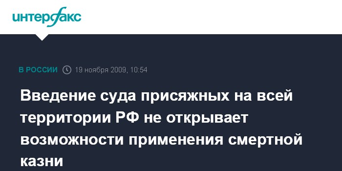Москва. 19 ноября. INTERFAX.RU - Введение на всей территории РФ с 1 января 2010 года судов присяжных не означает, что в стране может назначаться смертная казнь, определил Конституционный суд РФ.