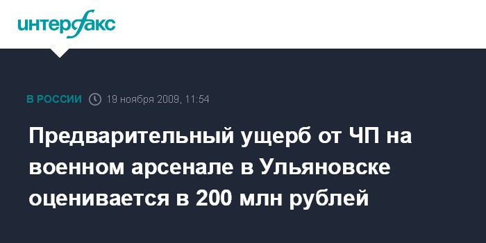 Москва. 19 ноября. INTERFAX.RU - Общая сумма ущерба от аварии на военном арсенале в Ульяновске составляет, по предварительным данным, 200 млн рублей, сообщили агентству "Интерфакс-Поволжье" в пресс-службе городской думы.