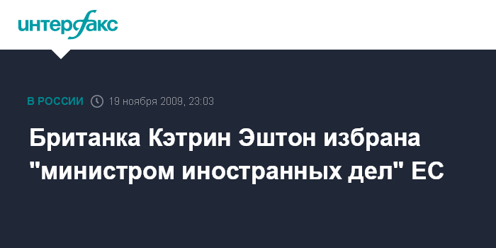 Брюссель. 19 ноября. ИНТЕРФАКС - Главы государств и правительств стран ЕС избрали британку Кэтрин Эштон на должность верховного представителя по иностранным делам и политике безопасности, сообщает агентство ЭФЭ со ссылкой на источники в Евросоюзе.