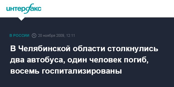 Москва. 20 ноября. INTERFAX.RU – В Озерске (Челябинская область) в пятницу утром произошло лобовое столкновение двух автобусов, в результате один человек погиб, еще восемь получили травмы.