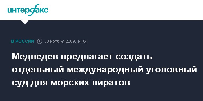 Москва. 20 ноября. INTERFAX.RU - Президент России считает, что для противостояния такой глобальной угрозе, как пиратство, необходимо создание международного уголовного суда. "Россия как постоянный член Совбеза ООН выступает за то, чтобы выработать здесь согласованные меры противодействия, включая создание отдельного уголовного суда по пиратству", - сказал Медведев в пятницу на встрече в Москве с министрами транспорта иностранных государств.