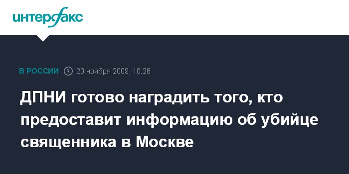 Москва. 20 ноября. INTERFAX.RU - "Движение против нелегальной иммиграции" (ДПНИ) объявило награду в размере 100 тыс. рублей за информацию, которая поможет найти убийцу священника Даниила Сысоева.