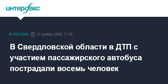 Москва. 21 ноября. INTERFAX.RU - В результате столкновения автомобиля ВАЗ-21054 и пассажирского автобуса ПАЗ, следовавшего по маршруту Богданович-Екатеринбург, пострадали восемь человек.