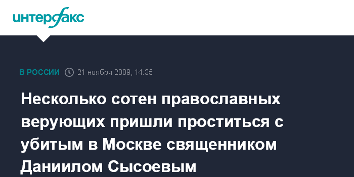 Москва. 21 ноября. INTERFAX.RU - Возле храма Апостола Фомы на Кантемировской в Москве собралось несколько сотен человек, желающих проститься со священником Даниилом Сысоевым, застреленным в ночь с четверга на пятницу.