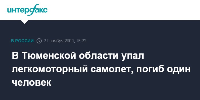 Москва. 21 ноября. INTERFAX.RU - В Тюменской области в субботу в 12:00 (время местное) в результате падения легкомоторного 4-местного самолета в районе деревни Калиновка в Нижнетавдинском районе погиб один человек.