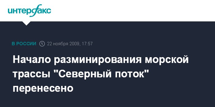 Хельсинки. 22 ноября. INTERFAX.RU - Разминирование морского дна в Финском заливе, где должна пройти трасса газопровода "Северный поток", отложено на несколько дней. "Начало работ по практическому разминированию перенесено по техническим причинам на вторник", - сообщила морская пограничная охрана Финляндии.