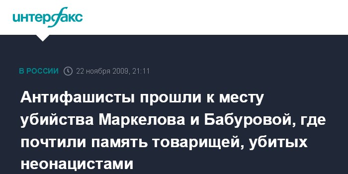Как сообщила "Интерфаксу" одна из участниц акции, несколько десятков молодых людей прошли шествием от памятника Достоевскому у библиотеки им. Ленина до станции метро "Кропоткинская". Недалеко отсюда были убиты адвокат Станислав Маркелов и журналистка "Новой газеты" Анастасия Бабурова.