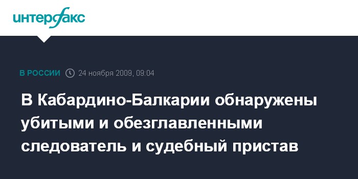 Москва. 24 ноября. INTERFAX.RU - В Кабардино-Балкарии в городе Чегеме обнаружены убитыми следователь одного из районных ОВД и сотрудник Федеральной службы судебных приставов (ФССП) РФ по республике.