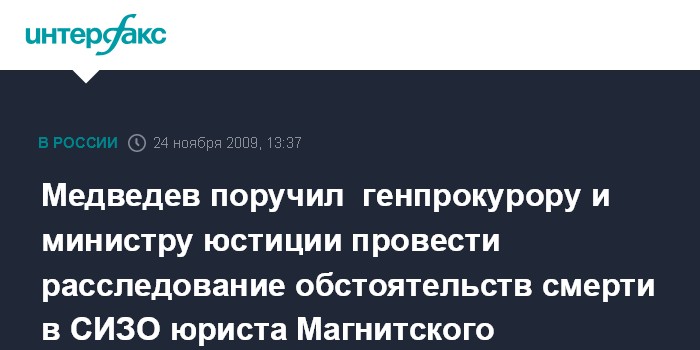 Медведев поручил генпрокурору и министру юстиции провести расследование обстоятельств смерти в СИЗО юриста Магнитского