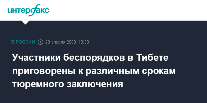Москва. 29 апреля. INTERFAX.RU - Суд промежуточной инстанции города Лхаса (административный центр Тибетского автономного района) приговорил 17 участников мартовских массовых беспорядков к разным срокам тюремного заключения - от трех лет до пожизненного.