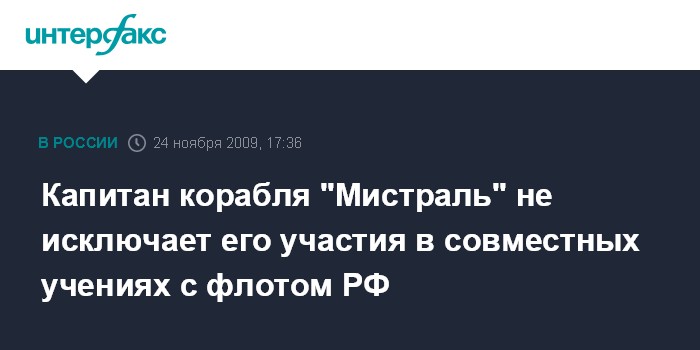 Москва. 24 ноября. INTERFAX.RU - Вертолетоносец французских ВМФ "Мистраль" в ближайшее время может принять участие в учениях совместно с Российским Военно-морским флотом, сообщил журналистам командир корабля Дидье Пьятон. "Во время захода в Петербург корабль посещали инженеры, военные. Мы поговорили о нескольких вещах, потому что будут, возможно, совместные учения", - сказал Пьятон в Санкт-Петербурге во вторник. Он не уточнил театр и сроки возможных учений, но добавил, что в них могут принять участие российские вертолеты, которые будут отрабатывать взлет и посадку на палубу корабля.