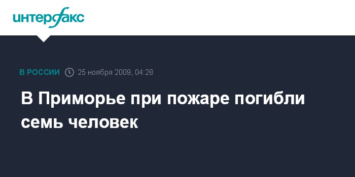 Владивосток. 25 ноября. ИНТЕРФАКС - ДАЛЬНИЙ ВОСТОК - В жилом доме в поселке Тавричанка Приморского края во время пожара, произошедшего в ночь на среду, погибли семь человек.