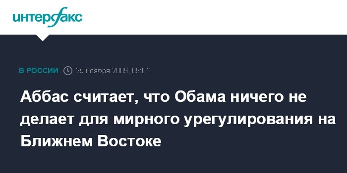 Москва. 25 ноября. INTERFAX.RU - Глава Палестинской национальной администрации Махмуд Аббас считает, что президент США Барак Обама пока ничего не предпринимает для ускорения процесса мирного урегулирования на Ближнем Востоке. В интервью аргентинской газете "Кларин" глава ПНА отметил, что палестинцы надеются, что США "окажут давление на Израиль, чтобы вынудить его соблюдать международное право, а также, чтобы был претворен в жизнь план "Дорожная карта". Кроме того, Аббас выражает надежду на то, что Обама в дальнейшем "будет играть более важную роль" в процессе палестино-израильского урегулирования.