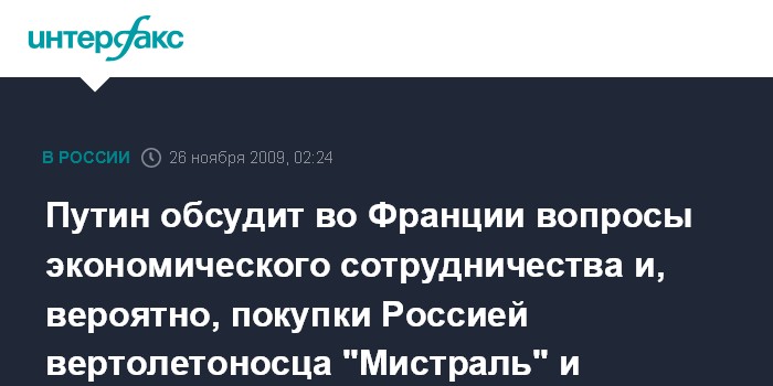 Путин обсудит во Франции вопросы экономического сотрудничества и, вероятно, покупки Россией вертолетоносца "Мистраль" и иранскую ядерную проблему
