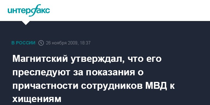 Как говорится в сообщении фонда, распространенном в четверг в Москве, за месяц до смерти, 13 октября, Магнитский заявил на допросе, что сотрудники правоохранительных органов "организовали незаконное преследование по сфабрикованным основаниям в качестве мести за его показания о причастности сотрудников МВД РФ к хищению бюджетных средств".