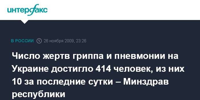 Киев. 26 ноября. ИНТЕРФАКС-УКРАИНА - По состоянию на 26 ноября количество жертв заболевания гриппом и ОРВИ возросло на Украине до 414 человек.