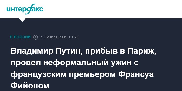 Владимир Путин, прибыв в Париж, провел неформальный ужин с французским премьером Франсуа Фийоном