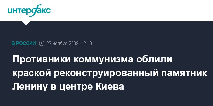 Москва. 27 ноября. INTERFAX.RU - Сторонники Всеукраинского объединения "Свобода" облили краской реконструированный памятник Ленину на Бессарабской площади столицы. Как передает корреспондент агентства, инцидент произошел во время официального открытия памятника при участии представителей КПУ и около 200 их сторонников в пятницу в Киеве.