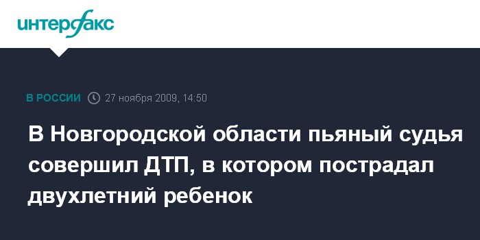 Великий Новгород. 27 ноября. INTERFAX.RU - Федеральный судья Новгородского городского суда совершил в пьяном виде ДТП, в котором пострадал двухлетний ребенок.