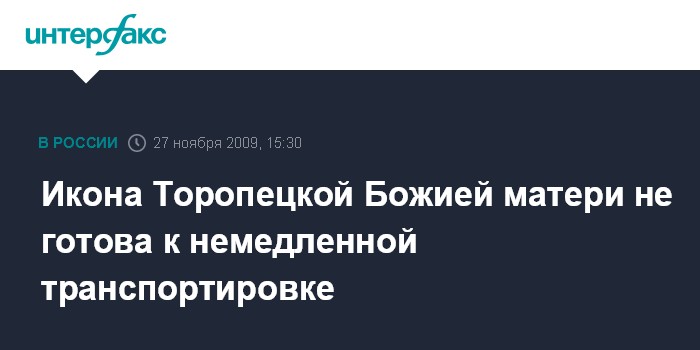 Санкт-Петербург. 27 ноября. INTERFAX.RU - Торопецкая икона "Богоматерь Одигитрия" не готова к быстрой транспортировке в Подмосковье, сообщили "Интерфаксу" в пресс-службе Государственного Русского музея в пятницу.