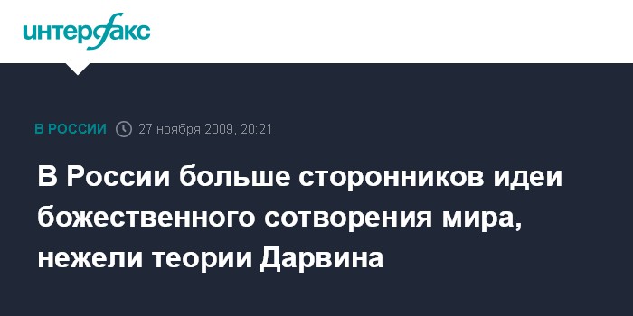 Москва. 27 ноября. INTERFAX.RU - Концепции божественного сотворения мира (креационизма) придерживаются 44% россиян, в то время как теории эволюции Дарвина - 35%, сообщили "Интерфаксу" в пятницу во Всероссийском центре изучения общественного мнения.