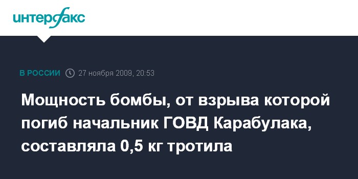Назрань. 27 ноября. INTERFAX.EU - Мощность взрывного устройства, от взрыва которого погиб начальник ГОВД Карабулака Адыл-Кирим Цечоев, по предварительным данным, составляла не мене 500 граммов в тротиловом эквиваленте, сообщает СКП РФ.