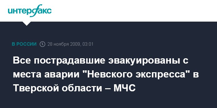 Москва. 28 ноября. ИНТЕРФАКС - Все пострадавшие эвакуированы с места аварии пассажирского поезда в Тверской области. Об этом было доложено главе МЧС России Сергею Шойгу в ходе заседания Федерального оперативного штаба, в котором также принимают участие глава МВД Рашид Нургалиев, министр здравоохранения и социального развития Татьяна Голикова и глава Минтранса Игорь Левитин.