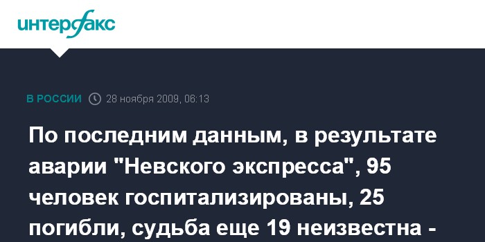 По последним данным, в результате аварии "Невского экспресса", 95 человек госпитализированы, 25 погибли, судьба еще 19 неизвестна - Голикова