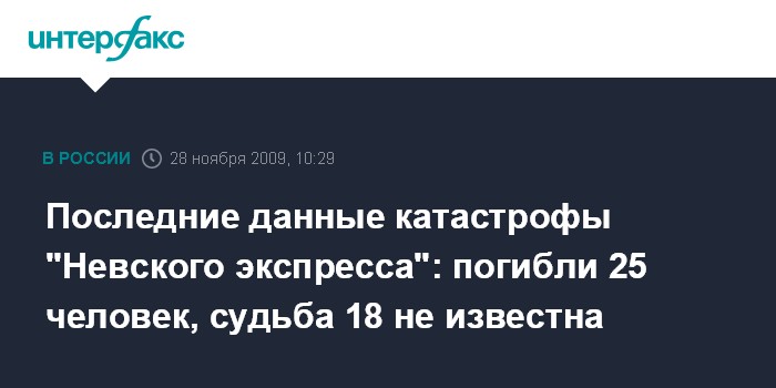 Москва. 28 ноября INTERFAX.RU - По последним данным, в результате крушения поезда "Невский экспресс" погибли 25 человек, судьба 18 не известна, заявил в субботу на оперативном селекторном совещании в центре по управлению в кризисных ситуациях глава МЧС России Сергей Шойгу.