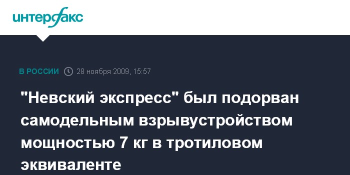 Москва. 28 ноября INTERFAX.RU - Глава ФСБ России Александр Бортников доложил президенту Дмитрию Медведеву о том, что причиной катастрофы "Невского экспресса" стал взрыв самодельного взрывного устройства мощностью 7 килограммов.