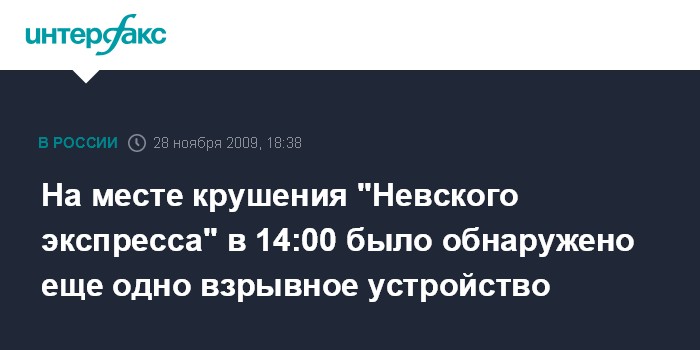 Москва. 28 ноября INTERFAX.RU - На месте крушения "Невского экспресса" в субботу было обнаружено еще одно взрывное устройство, оно сработало в неполную силу, заявил глава РЖД Якунин.