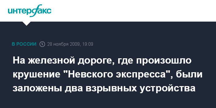 Москва. 28 ноября INTERFAX.RU - На железнодорожных путях в районе Бологое были заложены два взрывных устройства, одно из которых стало причиной крушения поезда "Невский экспресс".