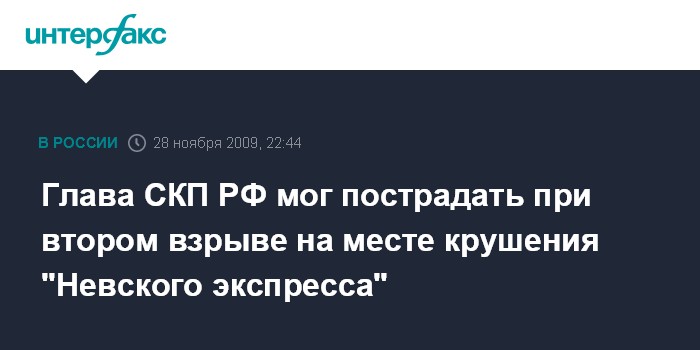 Москва. 28 ноября. INTERFAX.RU - Второе взрывное устройство на месте крушения "Невского экспресса" сработало во время осмотра, который проводил там лично глава СКП РФ Александр Бастрыкин, сообщил "Интерфаксу" официальный представитель СКП Владимир Маркин.
