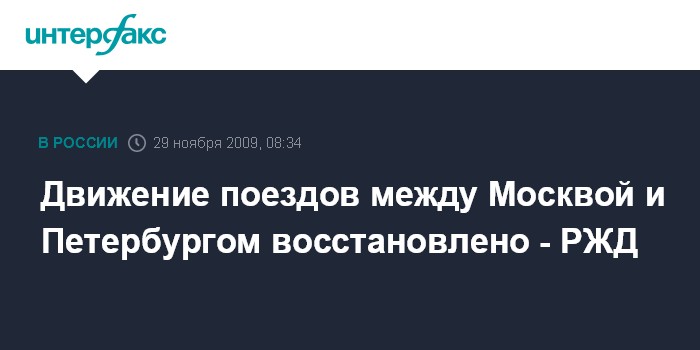 Москва. 29 ноября. ИНТЕРФАКС - Движение пассажирских поездов на маршруте Москва - Санкт-Петербург полностью восстановлено, сообщает РЖД.