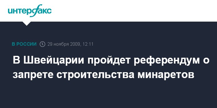Лондон. 29 ноября. INTERFAX.RU - В Швейцарии в воскресенье состоится референдум по вопросу о запрете на строительство минаретов в стране, сообщает Би-би-си. Предложение запретить строить башни, с которых мусульман созывают на молитву, выдвинуто ультраправой Народной партией, которая имеет крупнейшую фракцию в одной из палат швейцарского парламента. Партия считает, что минареты могут стать первым признаком исламизации Швейцарии.