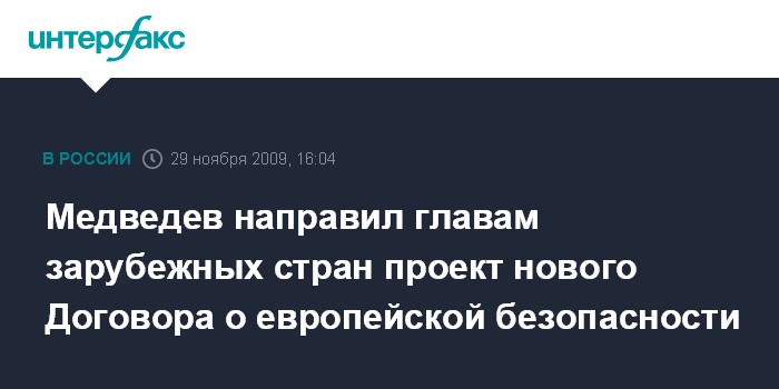 Москва. 29 ноября. INTERFAX.RU - Президент РФ Дмитрий Медведев направил руководителям зарубежных государств и международных организаций, действующих на евро-атлантическом пространстве, российские предложения по новому Договору о европейской безопасности, сообщает пресс-служба Кремля в воскресенье.