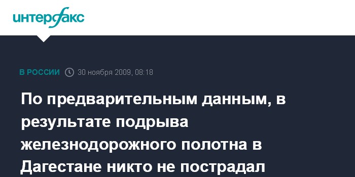 Москва. 30 ноября. INTERFAX.RU - Погибших и раненых в результате подрыва железнодорожного полотна в Дагестане, по предварительным данным, нет, сообщили в понедельник "Интерфаксу" в ОАО "РЖД".