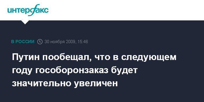 Москва. 30 ноября. ИНТЕРФАКС - Объем гособоронзаказа в 2010 г. будет увеличен почти до 1 трлн 175 млрд рублей, заявил премьер-министр РФ Владимир Путин на совещании по вопросу обеспечения вооруженных сил современным ракетным вооружением.