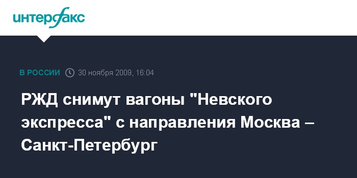 Москва. 30 ноября. INTERFAX.RU - ОАО "РЖД" планирует снять вагоны "Невского экспресса", потерпевшего крушение в пятницу, с направления Москва - Санкт-Петербург, сообщил вице-президент РЖД, глава Федеральной пассажирской дирекции Михаил Акулов в эфире радио "Эхо Москвы" в понедельник. "Вагоны будут сниматься с рейса при запуске в коммерческую эксплуатацию поезда "Сапсан". "Невский экспресс" будет ходить на других участках, с более низкими скоростями", - сказал он. Отвечая на вопрос о техническом состоянии "Невского экспресса", Акулов заявил, что вагоны были сертифицированы в 2006 г. и полностью соответствовали нормам безопасности.