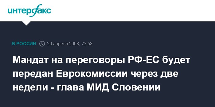 Люксембург. 29 апреля. ИНТЕРФАКС - Министр иностранных дел председательствующей в ЕС Словении Димитрий Рупел заявляет, что Евросоюз достигнет согласия относительно мандата на начало переговоров РФ-ЕС по новому базовому соглашению через две недели.