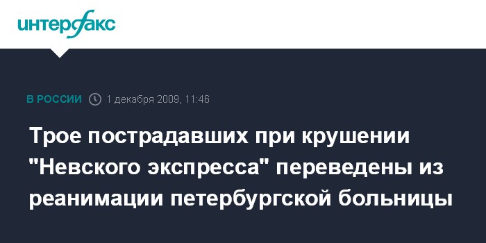 Москва. 1 декабря. INTERFAX.RU – В Петербурге врачи Дорожной клинической больницы и НИИ Скорой помощи им.Джанелидзе, принявших основной поток пострадавших с "Невского экспресса", пока не выписывают доставленных к ним больных.