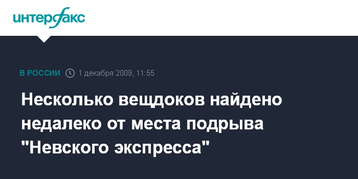 Москва. 1 декабря. INTERFAX.RU – Недалеко от места крушения поезда "Невский экспресс", произошедшего в минувшую пятницу, обнаружены вещественные доказательства, которые могут пролить свет на обстоятельства теракта, сообщил "Интерфаксу" источник в правоохранительных органах. По его словам, в настоящее время отрабатывается несколько направлений розыска предполагаемых преступников.