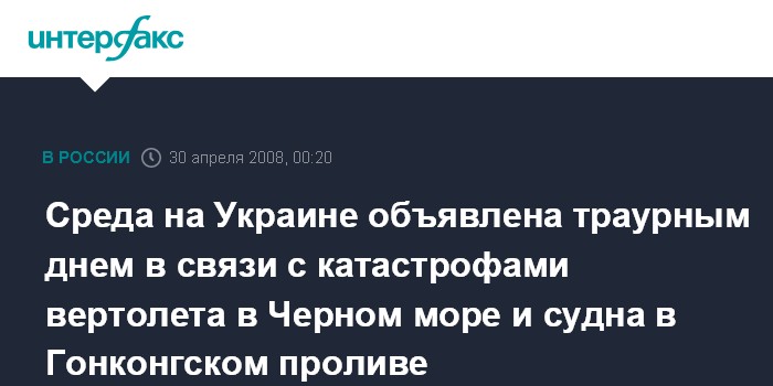 Киев. 30 апреля. ИНТЕРФАКС-УКРАИНА - В связи с катастрофами вертолета Ми-8 в Черном море и судна "Нафтогаз-67" в Южно-Китайском море, которые привели к многочисленным человеческим жертвам, президент Украины Виктор Ющенко объявил 30 апреля на Украине траурным днем.