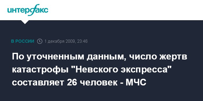 Москва. 1 декабря. ИНТЕРФАКС - МЧС России уточнило данные о погибших в результате катастрофы поезда "Невский экспресс".