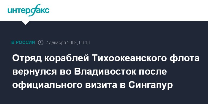 Владивосток. 2 декабря. ИНТЕРФАКС-ДАЛЬНИЙ ВОСТОК - Отряд кораблей Тихоокеанского флота (ТОФ) в составе гвардейского ракетного крейсера "Варяг", спасательного буксира "Фотий Крылов" и морского танкера "Печенга" после завершения официального визита в Сингапур вернулся к родным берегам.