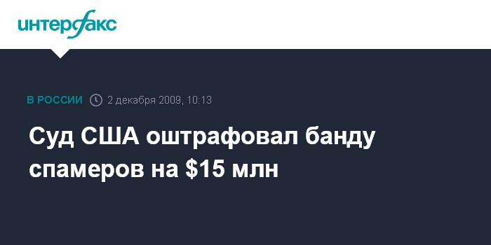Москва. 2 декабря. INTERFAX.RU - Организаторы широкомасштабной международной спамерской сети новозеландец Ланс Аткинсон и его подельница из США Джоди Смит решением суда США обязаны выплатить штраф в $15,15 млн за незаконное распространение электронной рекламы поддельных лекарственных препаратов, сообщает британская телерадиокорпорация ВВС.