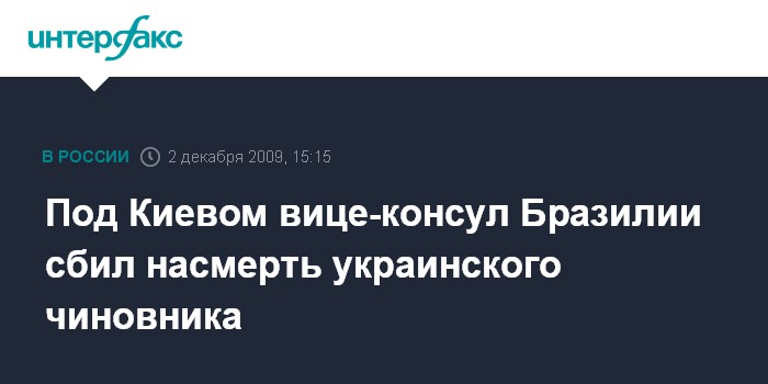 Киев. 2 декабря. INTERFAX.RU - Автомобиль, за рулем которого находился вице-консул Бразилии на Украине, сбил насмерть 43-летнего инспектора Департамента по вопросам исполнения наказаний, сообщили в среду агентству "Интерфакс" в центре общественных связей ГУМВД Украины в Киевской области.