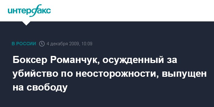 Москва. 3 декабря. INTERFAX.RU - Известный боксер Роман Романчук в ходе повторного судебного заседания в суде Фрунзенского района Владивостока признан виновным по ч.1 ст.109 УК РФ (причинение смерти по неосторожности), ему назначено наказание в виде 1 года 2 месяцев лишения свободы. Как передает корреспондент агентства "Интерфакс - Дальний Восток" из зала суда, поскольку это срок Романчук уже отбыл, он был освобожден в зале суда.